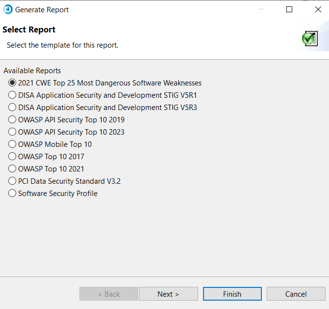 - Dans la boîte de dialogue Générer le rapport, sélectionnez un rapport AppScan® Source :