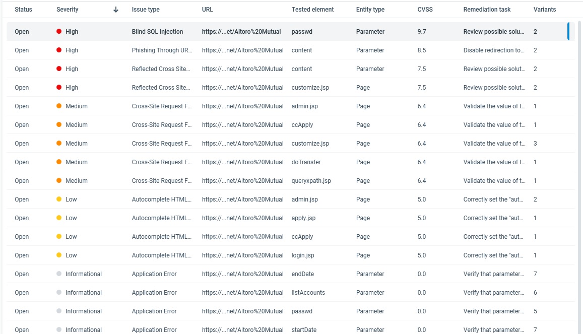 The Result List displays the issues relevant to the node selected in the Application Tree. If you selected the My Application node, the Result List shows all issues found in your web application.
