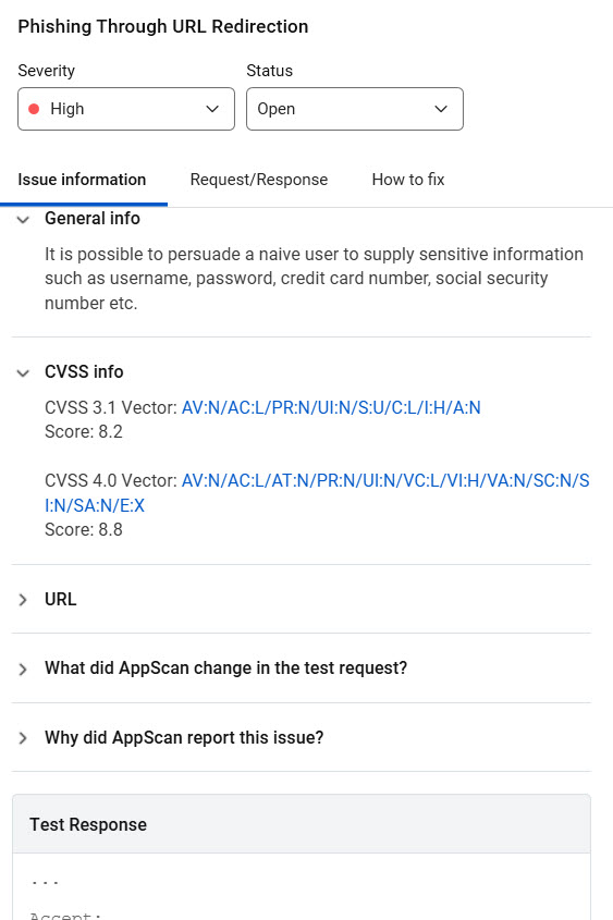 Lors de l'examen, comme des problèmes sont reconnus et ajoutés à l'arborescence, l'onglet Informations sur les problèmes fournit un récapitulatif des informations disponibles sur les autres onglets du Panneau des détails, ainsi que des informations supplémentaires précieuses telles que l'évaluation des métriques CVSS versions 3.1 et 4.0 pour le problème, et les captures d'écran associées qu'il est possible d'enregistrer avec les résultats et d'inclure dans vos rapports.