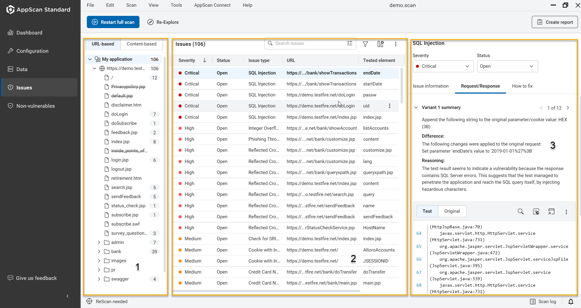 「問題」ビューでは、スキャンの結果にアクセスできます。結果を概略レベルで表示することも、特定のテストまたはオブジェクトを選択して詳細にアクセスすることもできます。これらの詳細には、修正方法、要求/応答、および問題が発生したテスト・バリアント間の差が含まれます。問題の重大度を操作したり、(修正ありまたは修正なしで) テストを再送したり、問題に基づいたレポートを作成したりできます。