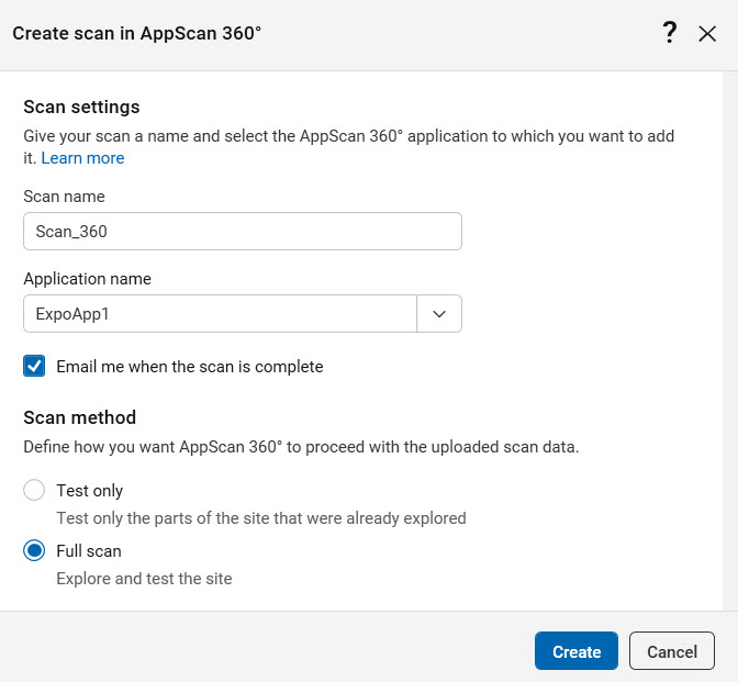 「AppScan 360° でスキャンを作成」ダイアログ・ボックスが開きます。 -