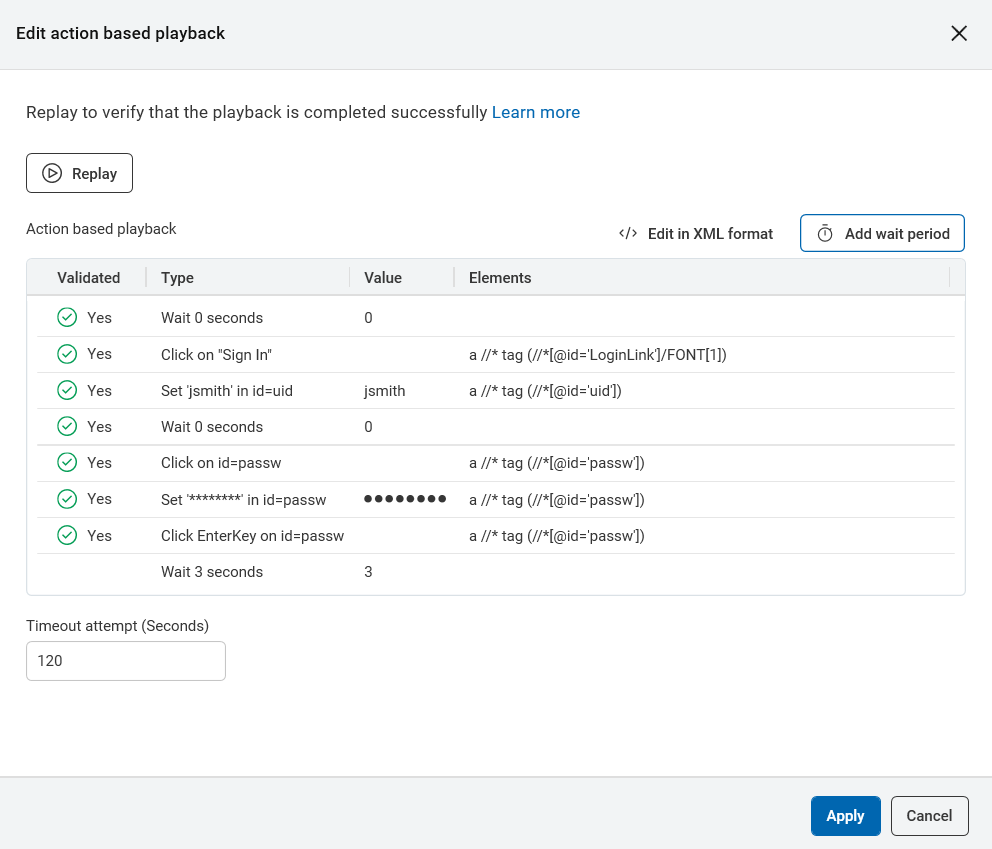 - 如果缺少其他操作、浏览器已到期或密码已到期,请检查浏览器回放。