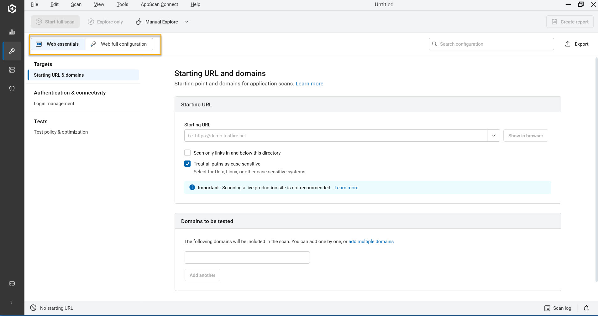| Web 必要項目 | 配置起始 URL 和網域、登入管理以及「測試原則和最佳化」,然後開始掃描。 |