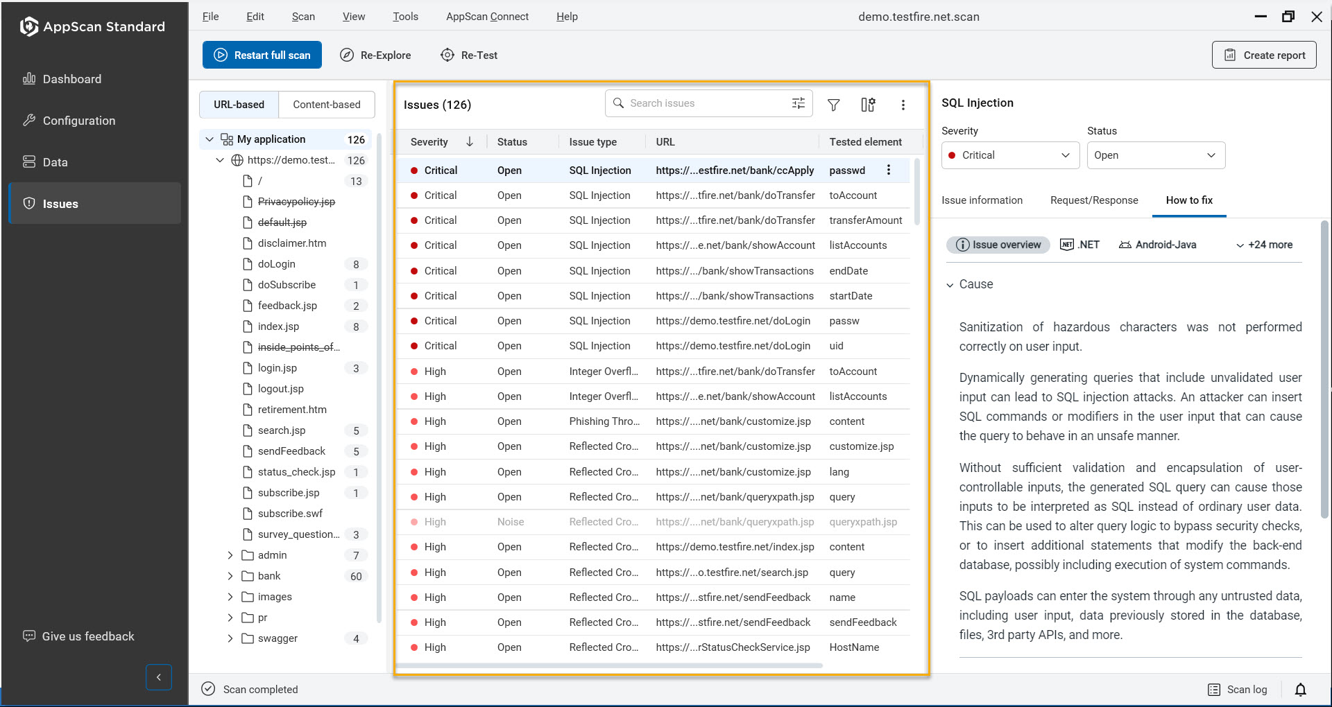 The total number of security issues (at the top of the Result List) is a measure of the vulnerable locations in the site and depends in part on how the site is structured. If you define a content-based structure, the total number of issues in the application tree may not be the same as it is for the URL-based application tree (for the same results). When site structure is content-based (rather than URL-based), and the content-based view is configured correctly, the issue count in the content-based view represents more accurately the number of "vulnerable locations" that exist in the site. The total number of variants (at the top of the Result List in parentheses) is independent of site structure and does not change between content-based and URL-based views.