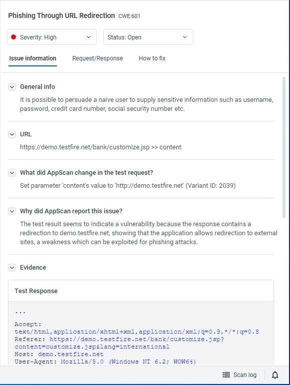 在扫描期间,随着问题被发现并添加到树中,“问题信息”选项卡将汇总其他“详细信息”窗格选项卡上可用的信息,以及可随结果一起保存并包含在报告中的有价值的附加信息,例如问题的 CVSS v3.1 度量评分以及相关截屏。