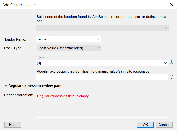If requests have been recorded, and AppScan has identified a custom header, it will appear in a drop-down list at the top of the dialog box. If no custom headers have been found, this drop-down list does not appear. If you select a header from this list, the remaining fields are filled automatically. |