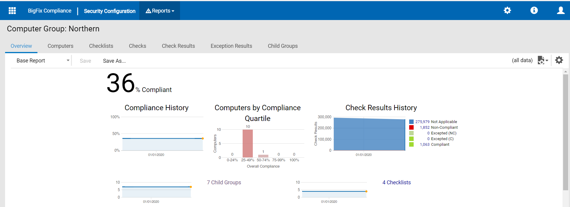 - The Computer Group Overview report represents a graphic representation of compliance history, computers by compliance quartile, child groups, checklists and check results history with an overall compliance percentage shown in the top left corner of the console.