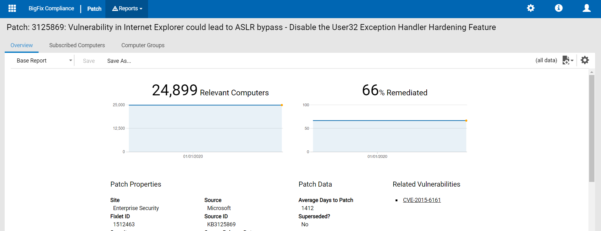 The Patch Overview report represents a graphical representation of the relevant computers, %remediated, patch properties, patch data and related vulnerabilities.
