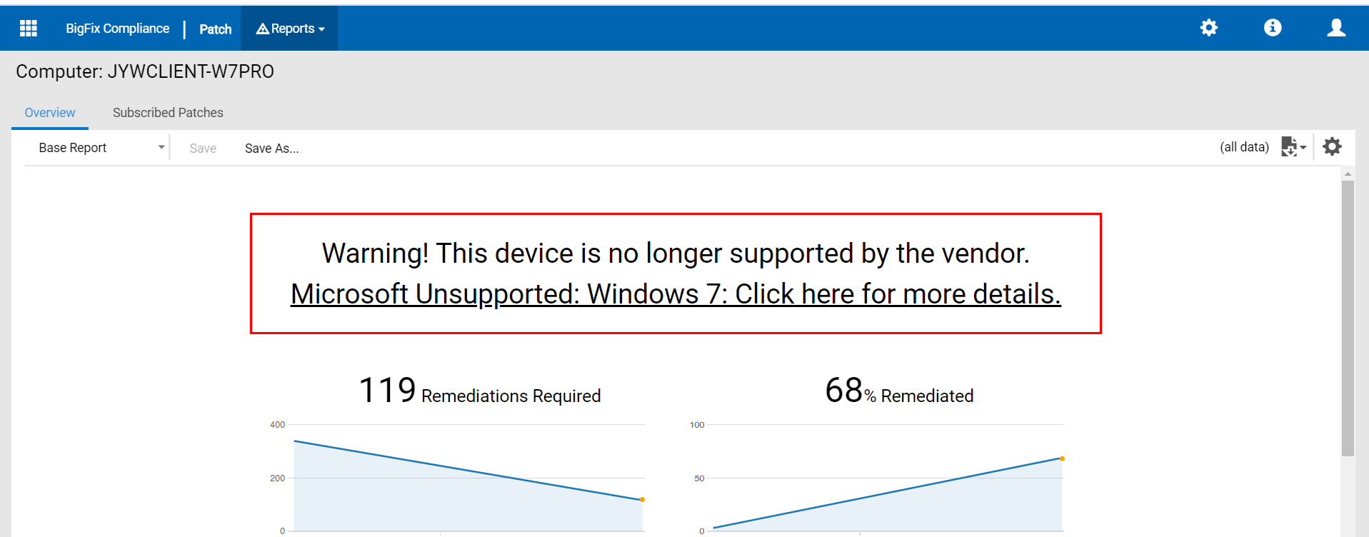 - The Computer Overview report represents a graphic representation of remediations required, % remediated and a warning note.