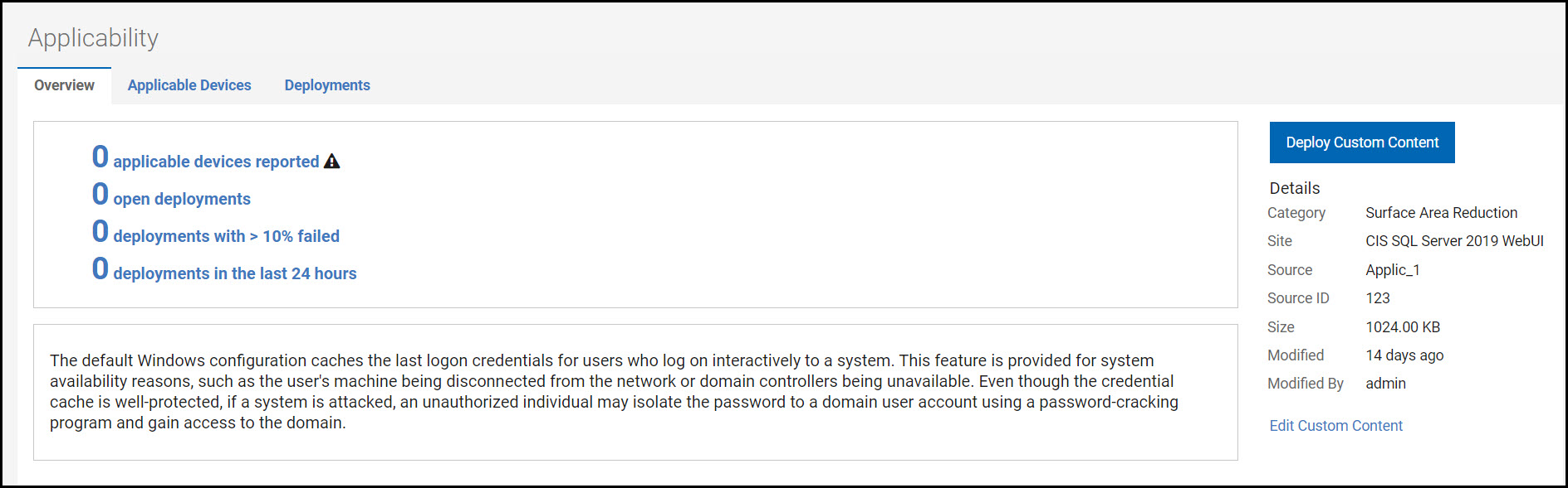 When the custom check is created, Compliance check creation wizard navigates to the custom check details page. The details page contains Overview, Applicable Devices and Deployment sections.