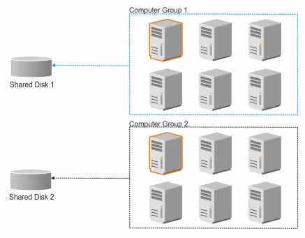Dans chaque groupe, sélectionnez un ordinateur à analyser. Les résultats d'analyse de l'ordinateur désigné sont propagés aux ordinateurs restants du groupe d'ordinateurs. Par conséquent, les logiciels installés sur le disque partagé 1 sont indiqués sur tous les ordinateurs du groupe d'ordinateurs 1 sans qu'il ne soit nécessaire d'analyser tous les ordinateurs de ce groupe. Il en est de même pour les ordinateurs du groupe d'ordinateurs 2.