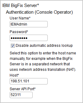 Pendant la configuration initiale d'BigFix Inventory, lorsque vous spécifiez les détails de connexion du serveur BigFix, sélectionnez Désactiver la recherche automatique d'adresse, et saisissez le nom d'hôte du serveur BigFix. L'adresse est toujours créée d'après le nom d'hôte et le numéro de port fournis.