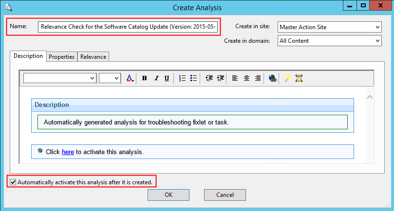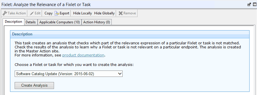 - Dans le panneau supérieur droit, sélectionnez Analyze the Relevance of a Fixlet or Task.