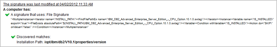 Il peut arriver qu'une version plus ancienne du logiciel soit découverte après la mise à niveau, ou que la signature du logiciel n'ait pas été supprimée de l'ordinateur pendant la désinstallation. La découverte de faux positifs peut également être liée à des sauvegardes de répertoires de logiciels ou de supports d'installation stockées sur les nœuds finaux et qui sont considérées comme des instances logicielles à part entière.