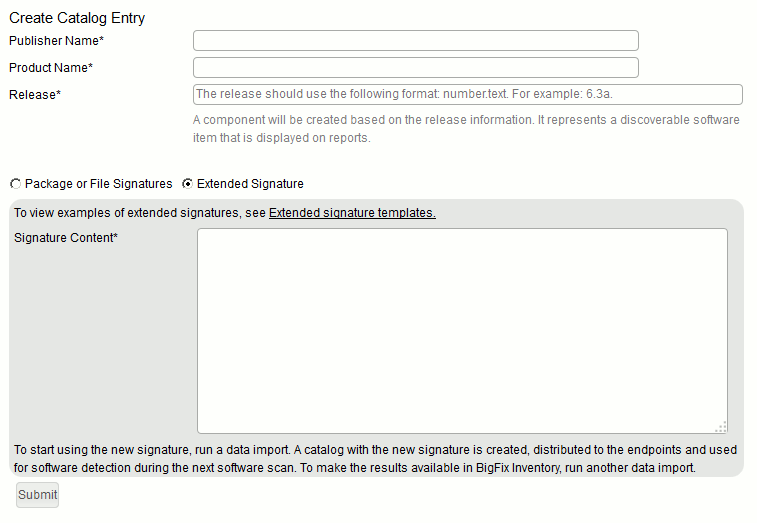 - Dans la section Créer une entrée de catalogue, indiquez le nom de l'éditeur, le nom du produit et le numéro de version du produit logiciel pour lequel vous créez la signature étendue.