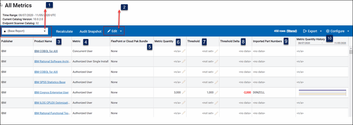 La principale source d'informations sur l'utilisation des métriques de licence est le rapport Toutes les métriques. Vous pouvez, pour chaque produit, définir un seuil de métrique pour vérifier si l'utilisation des métriques est au-dessus ou au-dessous de vos attentes. Vous pouvez également créer une image instantanée du rapport et stocker celle-ci dans une optique d'audit.