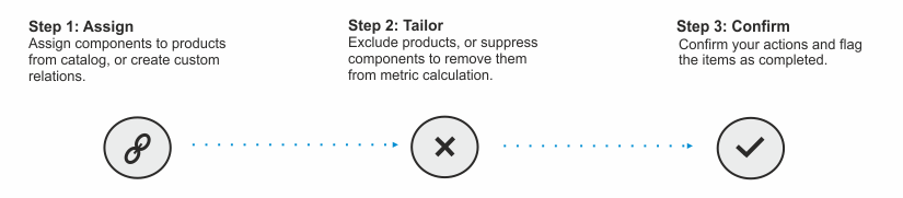 Une fois reconnus, les nouveaux composants sont affectés à des produits en fonction de règles de regroupement. Si l'affectation initiale ne reflète pas vos autorisations, manipulez l'inventaire des logiciels jusqu'à ce qu'il corresponde aux autorisations. Pour obtenir un calcul métrique exact, affectez chaque composant à un produit, excluez ou supprimez les instances qui ne doivent pas être incluses dans le calcul et confirmez vos actions. Une fois les actions confirmées, la classification est complète et le calcul de métrique est exact.