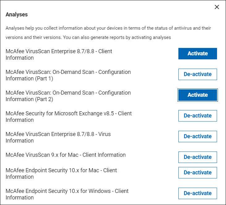 - アクティブ化: 特定のアンチウィルス状況とそのバージョンに関するレポートの収集を開始します。