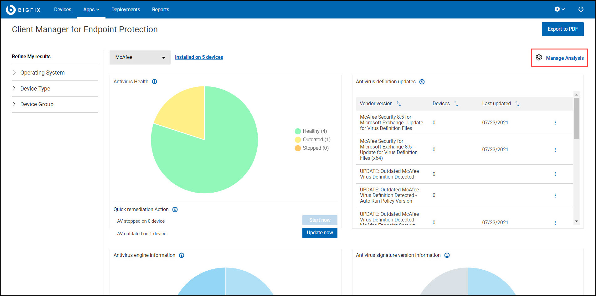 「分析の管理」を使用して、アンチウィルスとそのバージョンの状況を表示したり、分析をアクティブ化してレポートを生成したりします。