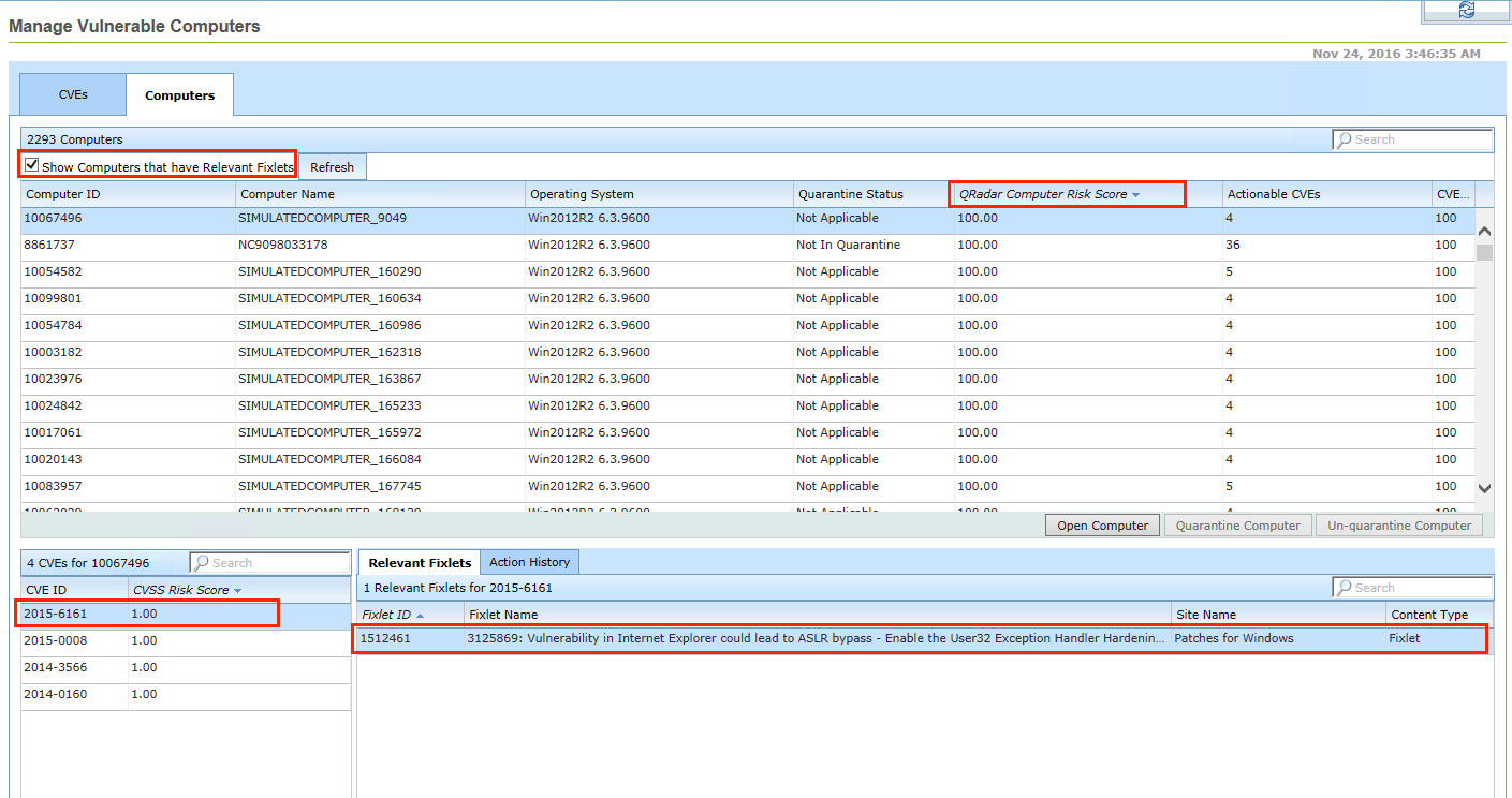 脆弱なコンピューターの管理 (Manage Vulnerable Computers) ダッシュボードからは、QRadar® が脆弱性に関する情報を送信する BigFix で管理しているコンピューターを確認できます。各コンピューターの QRadar® コンピューター・リスク・スコア、CVE 数、CVE リスク・スコア、隔離に関する情報を確認できます。フィルター処理すると、関連する Fixlet があるコンピューターのみを表示できます。コンピューターを隔離したり、隔離解除したりすることもできます。