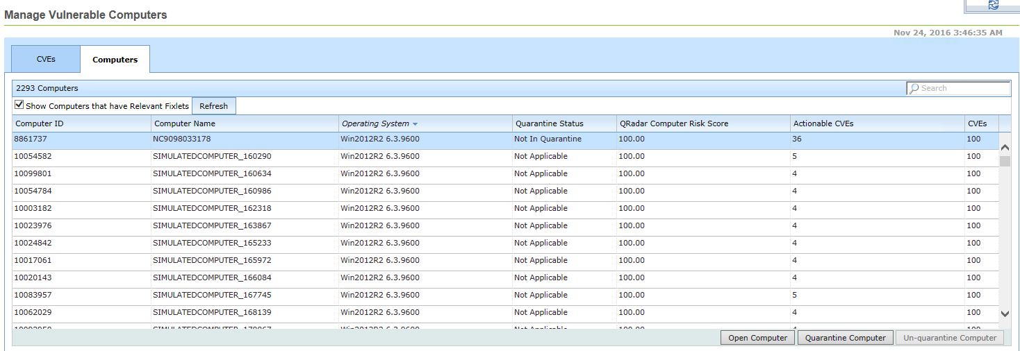 脆弱なコンピューターの管理 (Manage Vulnerable Computers) ダッシュボードの「コンピューター」タブでは、BigFix オペレーターとして管理しているすべてのコンピューターが表示されます。コンピューターに関連するコンピューター ID、コンピューター名、リスク・スコア、隔離状態、CVE を確認できます。コンピューターを隔離することもできます。
