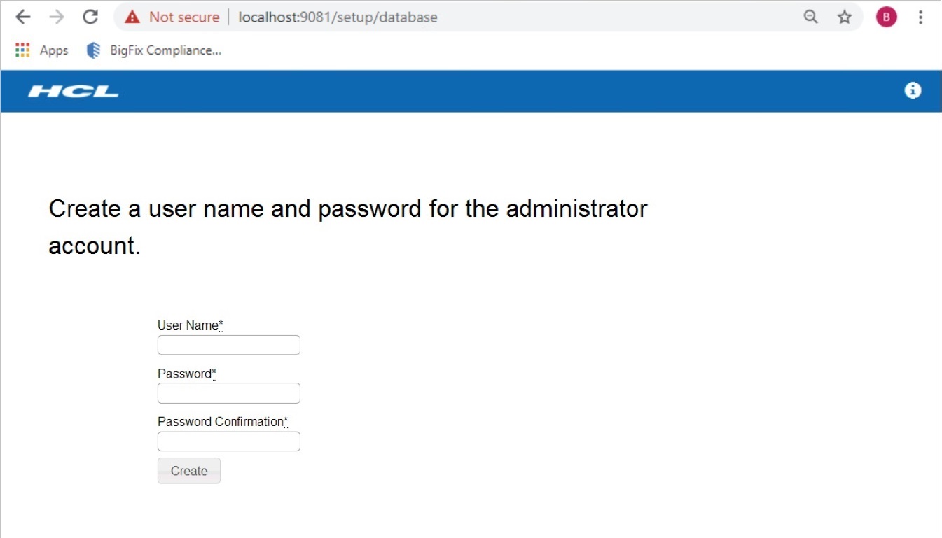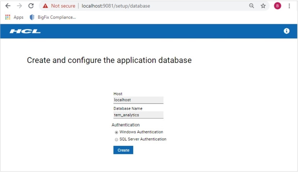 - BigFix Enterprise Server データベースに接続します。1 次 HCL BigFix データベースのホスト、データベース名、および認証方式を入力します。「作成」をクリックします。