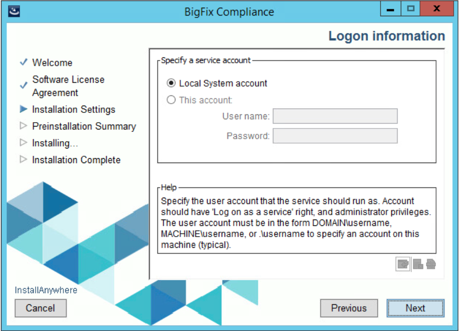 - BigFix Compliance Analytics サービスを実行するユーザー・アカウントを指定します。Windows により認証されたユーザーを介して SQL Server に接続するように HCL BigFix Analytics を構成する場合は、同じユーザーで HCL BigFix Analytics サービスが実行されるように構成する必要があります。