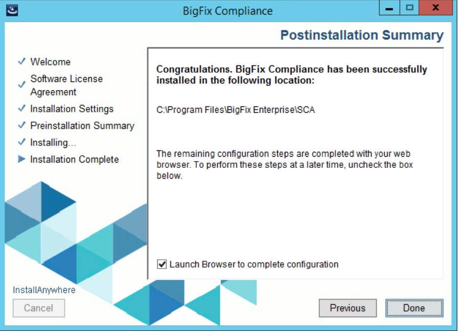 - インストーラーの最終ウィンドウで、Web ブラウザーを起動してセットアップを完了することを求めるプロンプトが出されます。「完了」 をクリックします。