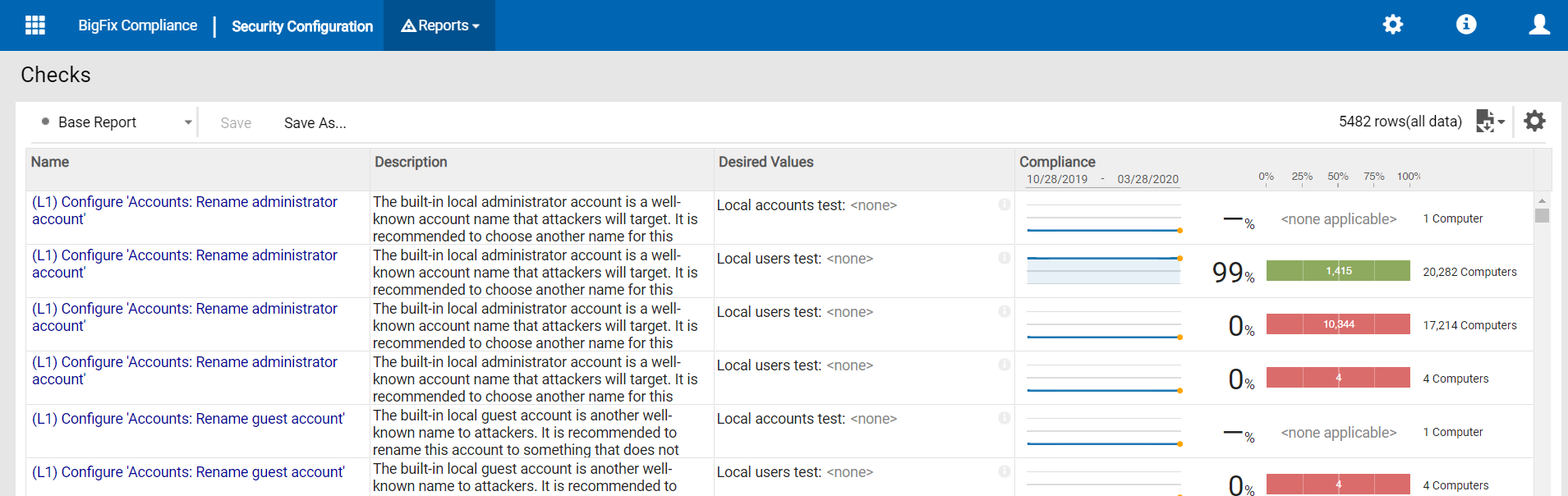 チェック・レポート 「ドメイン」を使用して「セキュリティー構成」ドメインを選択し、「レポート」をクリックして次のレポートを検索します。 チェック チェック、説明、望ましい値、これまでの全体的なコンプライアンス結果の集計のリスト・ビューが表示されます。