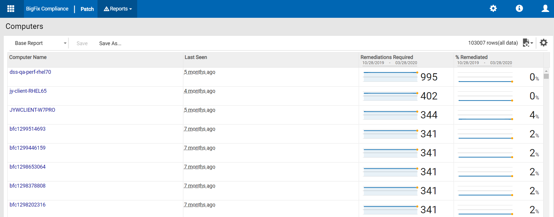 「コンピューター」レポート 「ドメイン」を使用してパッチ・ドメインを選択し、「レポート」をクリックして次のレポートを検索します。 Computers コンピューター、必要な修復、修復済みの割合が表示されます。