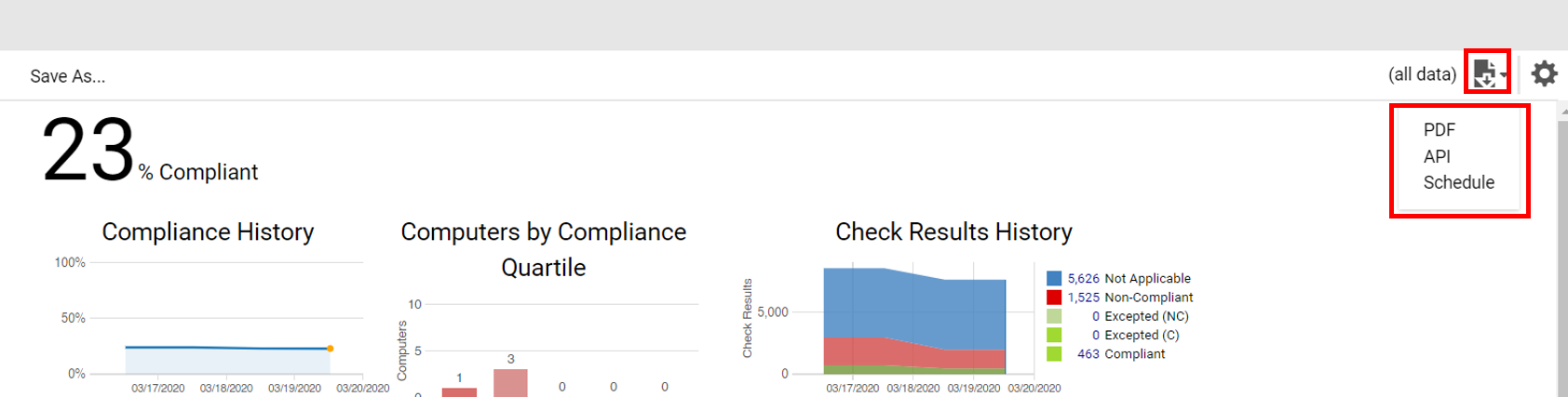 .csv、.pdf、API ファイル・フォーマットに対応するフォーマットでレポートをローカル・コンピューターにエクスポートできます。「エクスポート・オプション」アイコンをクリックし、CSV、PDF または API のリンクを選択すると、対応するフォーマットでレポートがエクスポートされます。