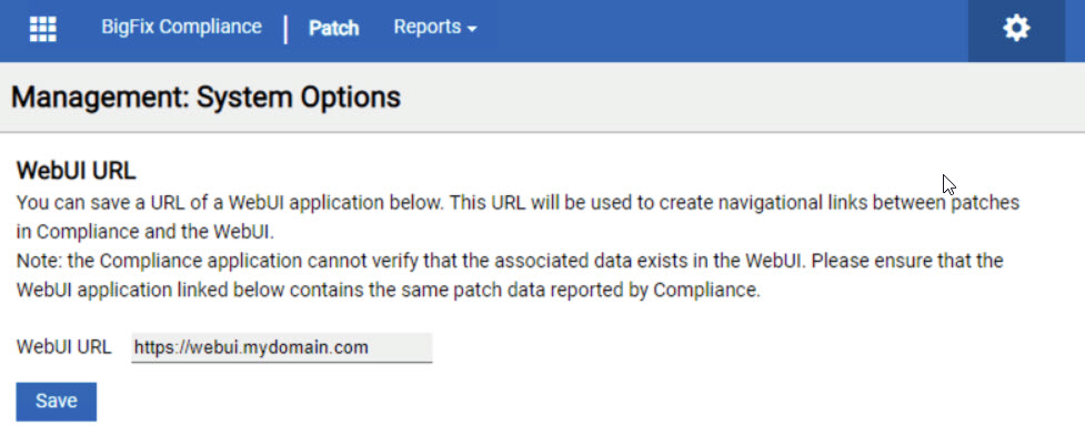 「システム・オプション」を使用して、Compliance のレポートに WebUI URL を追加します。