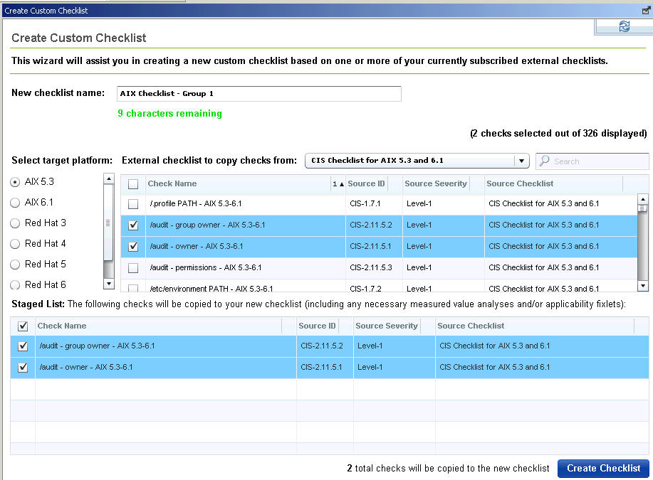 このウィザードを使用してカスタム・チェックリストを作成できます。