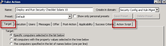 name of operating system = “SunOS 5.10 (not exists last active time of it or (now - last active time of it) > (15 *minute)) of action - 「アクション・スクリプト」タブをクリックして、ファイルを対象コンピューターにコピーするスクリプトを作成します。2 番目のボタンをクリックし、次の画面キャプチャーのようにスクリプトを入力します。