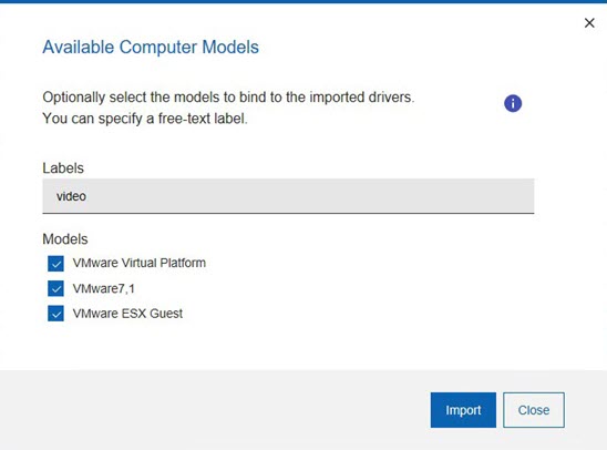 - オプションで、ハードウェア・モデルを選択して、インポートされたドライバーにバインドできます。ドライバーを特定のどのモデルにもバインドしない場合、そのドライバーは、既存の他のドライバーが特定のモデルにバインドされた後、「最良一致」基準を使用してインポートおよび管理されます。オプションで、1 つ以上のフリー・テキスト・ラベルを割り当てて、インポートするドライバーを容易に識別できるようにし、ドライバーの検索を簡素化することができます。指定したラベルおよびモデルは、ドライバー・ライブラリーの対応する列に表示されます。これらは両方ともオプションです。複数のラベルを指定する場合、各ラベルを