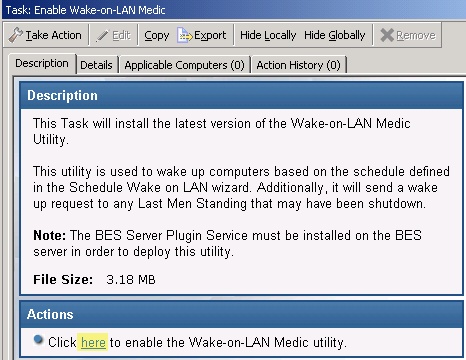 「Wake-On-LAN Medic ユーティリティ」を有効にするには、リスト・パネルで「有効化」タスクをクリックしてから、「タスク」ウィンドウの「アクション」ボックス内をクリックします。
