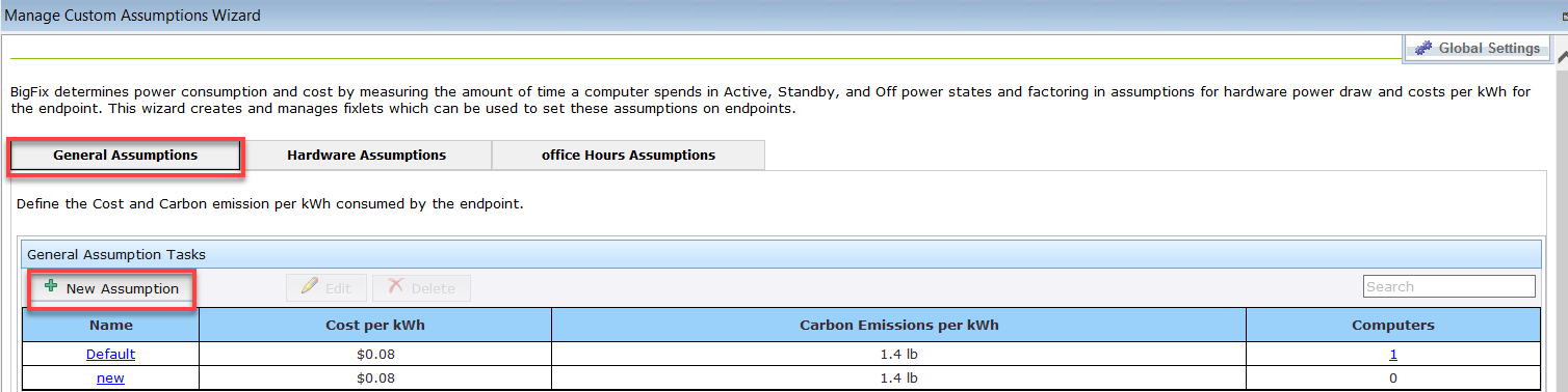 「カスタム想定値管理ウィザード」の「一般的な想定値」タブで、エンドポイントによって消費される kWh あたりのコストと二酸化炭素排出量を定義します。
