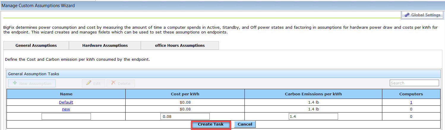 想定値の名前、kWh あたりのコスト、および kWh あたりの二酸化炭素排出量を入力します。「タスクの作成」をクリックします。