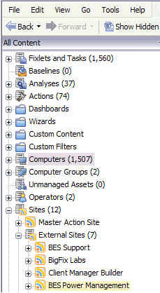 左側のドメイン・パネルに、「すべてのコンテンツ」ナビゲーション・ツリーが表示されます。「すべてのコンテンツ」ナビゲーション・ツリーで、「サイト」フォルダーを展開します。以前の電源管理サイトを強調表示して、作業パネルから「削除」をクリックします。