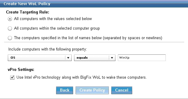 注: 「vPro 設定」オプションは、「Client Manager for Intel vPro」サイトをサブスクライブする場合にのみ有効になります。