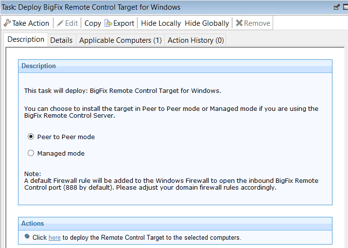 「アクションの実行」ペインの「対象」タブで、Remote Control ターゲットをデプロイするコンピューターを決定するための関連オプションを選択します。