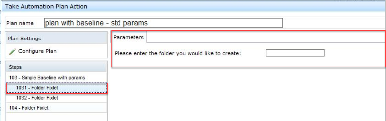 - ベースラインの下の子 Fixlet/ステップをクリックすると、 「パラメーター」タブが表示されます。