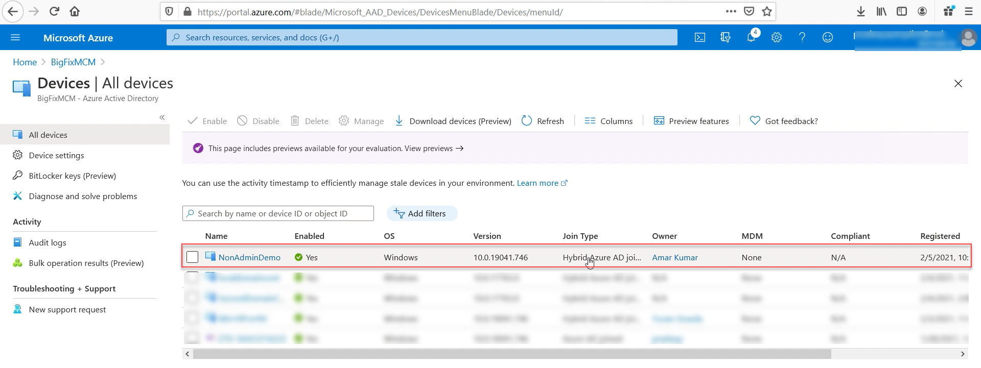 Hybrid Azure AD 参加デバイスは、オンプレミス AD と Azure AD の両方で表示されることを意味します。デバイスをドメイン・コントローラー (オンプレミス AD) に追加した後、オンプレミス AD を Azure AD に統合すると、デバイスは Hybrid Azure AD 参加デバイスになります。Azure AD 参加デバイスは、Azure AD が構成されると、自動的に BigFix MCM に登録されます。これにより、グループ・ポリシーを複数のデバイスに適用し、管理者以外のユーザー資格情報で BigFix MCM に登録できます。詳しくは、https://docs.microsoft.com/en-us/azure/active-directory/devices/concept-azure-ad-join-hybrid を参照してください。