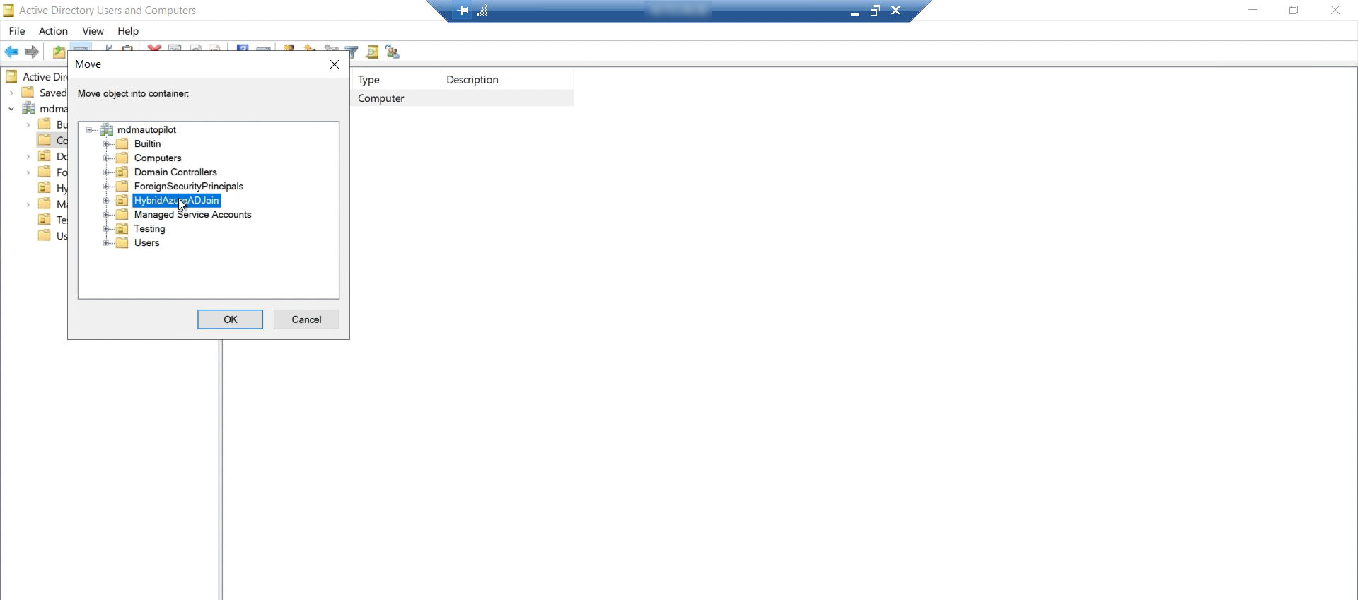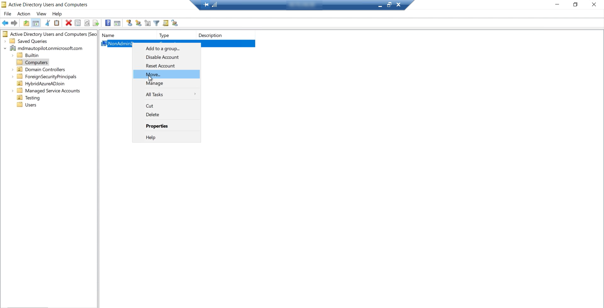 - コンピューターを組織に移動するには、 「Azure Directory Users and Computers」から 「Computers」 に移動します。