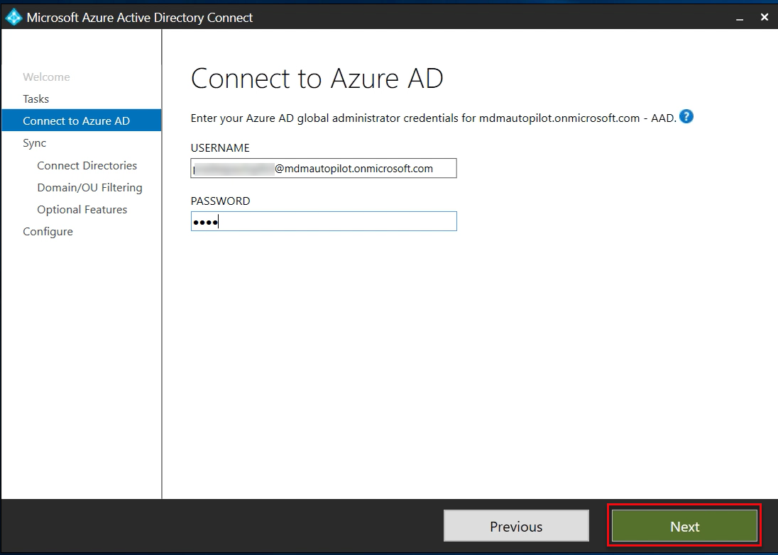 - Azure AD グローバル管理者の資格情報を入力し、「次へ」をクリックします。資格情報が検証され、Azure AD に接続されます。