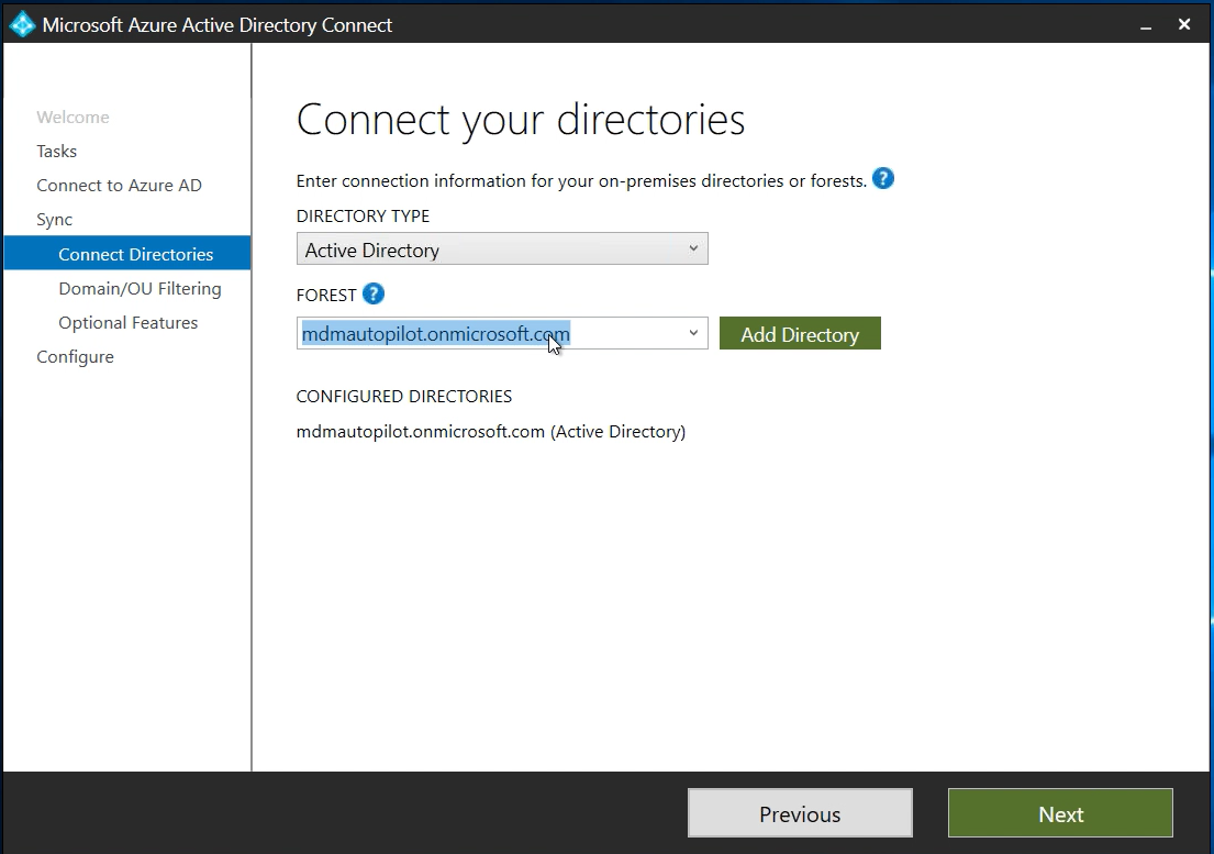 - Azure AD に接続したら、エンタープライズ管理者の資格情報を入力してオンプレミス AD に接続します。ディレクトリーを接続する画面が表示されたら、オンプレミス・ディレクトリーの接続情報を入力し、Add Directoryをクリックします。