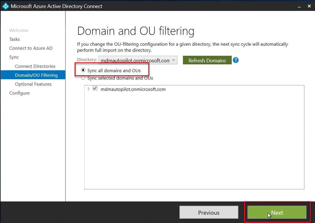 - 次の画面で、「Sync all domains and OUs」オプションを選択し、「次へ」をクリックします。