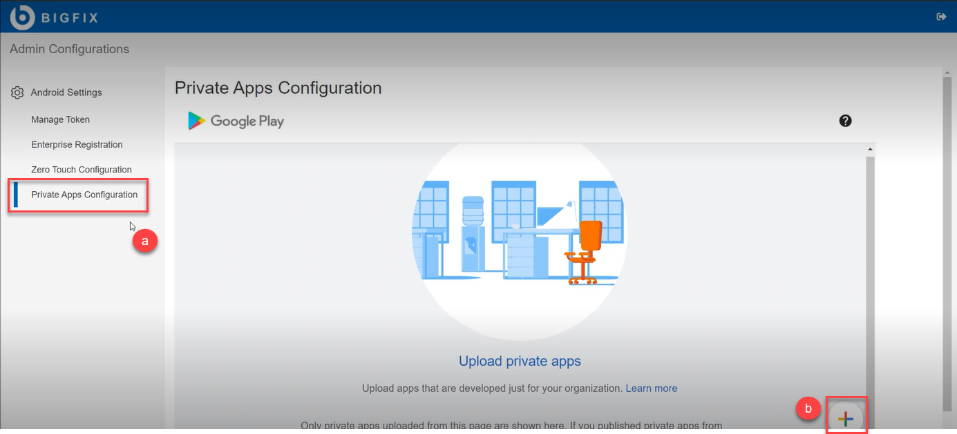 BigFix の「管理構成」ページから、「プライベート・アプリ構成」に移動し、「+」ボタンをクリックします。