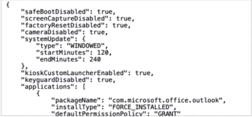 以下のコード・スニペットは、登録時に専用デバイスにデプロイされるデフォルトのカスタム JSON ポリシー・ファイル内のコードを示しています。
