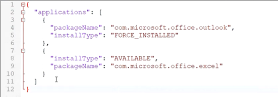 packageName: Android デバイスにインストールする必要がある Android アプリのバンドル ID。Google Play でアプリを見つけてクリックすると、アプリのページに移動します。アプリ ID は、?id=の後の URL に表示されます。例えば、Outlook の URL は https://play.google.com/store/apps/details?id=com.microsoft.office.outlook で、バンドル ID はcom.microsoft.office.outlookです。installType: FORCE_INSTALLLED または AVAILABLE。IT 管理者は、次の 2 つの方法を使用してアプリケーションを配布できます。-